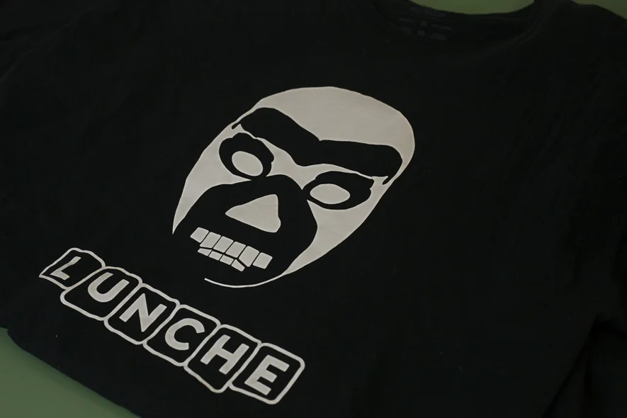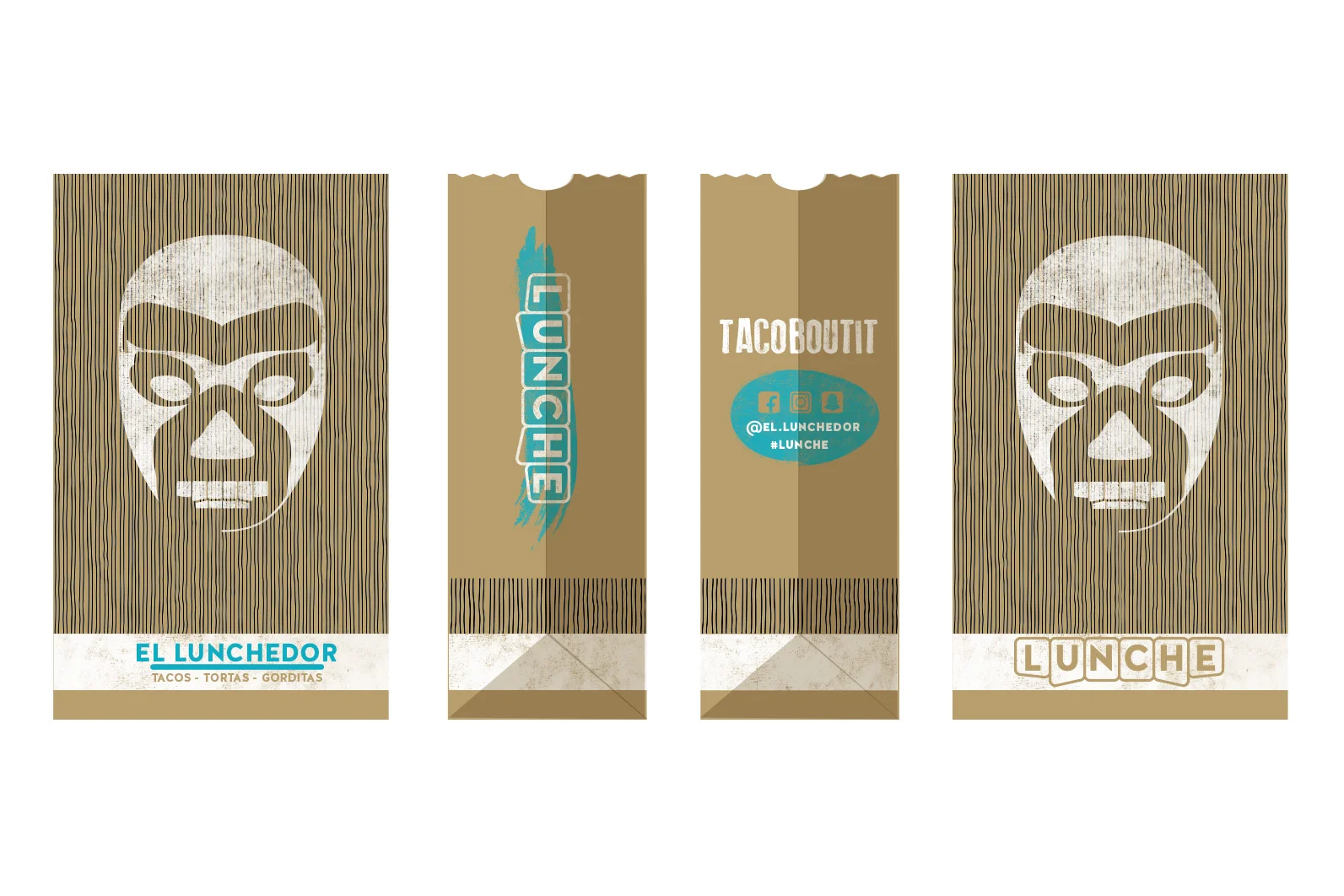 I had the idea of combining the words lunch and luchador for a taco truck. I wanted to incorporate imagery from the world of Lucha Libre, including the color palette, bold typefaces, and a rough, handmade texture.